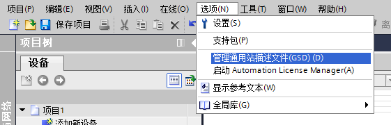 六、如果沒有安裝過 MCA102 的 GSD 文件,則需點擊‘選項’-‘安裝設備描述文件’, 操作如圖六所示。若已安裝則直接進入第七步。