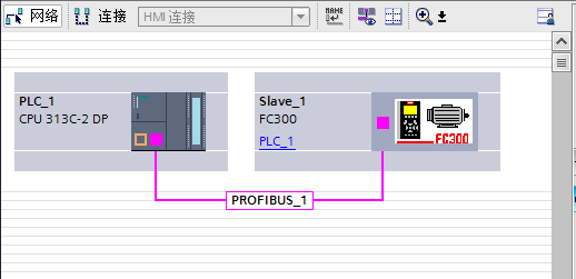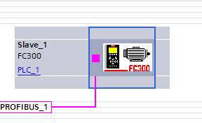 將變頻器 FC300 拖動到 PROFIBUS_1 連接線處后,PLC 和變頻器連接在一起,FC300 顯 示為未分配。