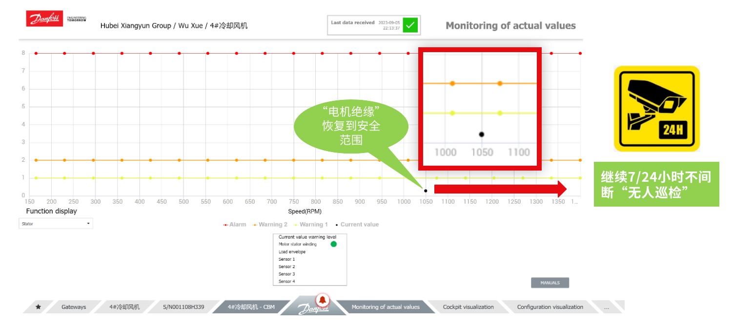 改造方案的目的是讓現(xiàn)場技術人員能夠對系統(tǒng)進行實時監(jiān)控,同時可以提前預警,防止非計劃停機。祥云化工最終同丹佛斯達成一致,合作開發(fā)數(shù)字化解決方案,增加丹管家+CBM(電機繞組絕緣,電機負載包絡),并于2021年年底正式上線。