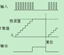 計數(shù)器的工作時序圖如圖二,當(dāng)產(chǎn)品數(shù)量計數(shù)到達(dá)預(yù)設(shè)值時,計數(shù)器數(shù)字量輸出信號動作,中止主機運行。等用戶將計數(shù)器復(fù)位以后,主機又可以再次運行。
