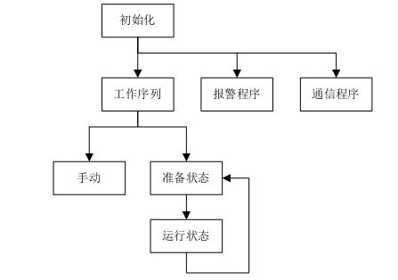 開機后,首先進行通信和狀態的初始化。初始化完成后同時調用工作序列、報警和通信子程序。工作序列中,包含手動和自動兩種狀態,自動運行又包括單次鋸切和連續鋸切兩種工作模式。報警程序用于對機器狀態進行實時監控,并根據故障情況執行相關動作。通信程序用于PLC和變頻器的FC協議通信,實現運行狀態和報警信息的監控。
