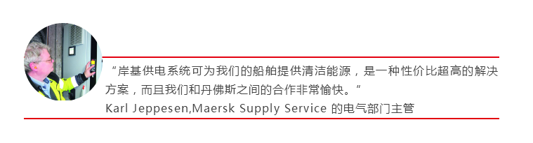 2017年初,Maersk Supply Service公司的電氣部門主管Karl Jeppesen針對(duì)公司管理提出了一個(gè)商業(yè)案例,即使用岸電為船舶供電,預(yù)計(jì)在6個(gè)月內(nèi)實(shí)現(xiàn)投資回報(bào)。很快,公司就通過了這個(gè)岸電項(xiàng)目,而且到2017年10月時(shí)整套系統(tǒng)就已完全投入運(yùn)行。