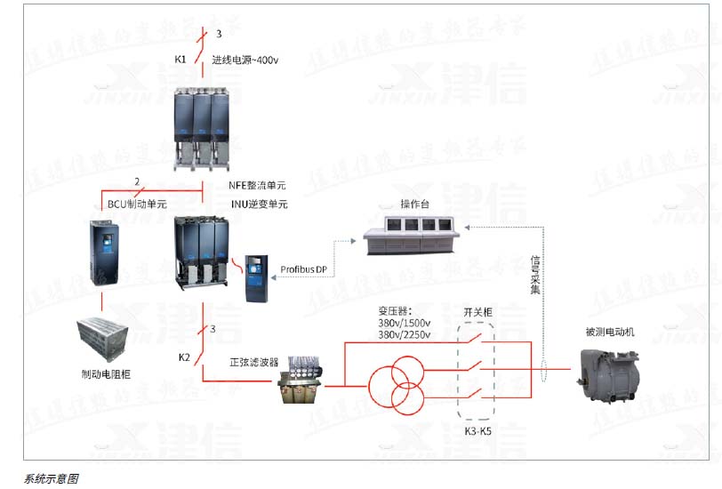 這個項目是Danfoss公司首次同天作電氣的合作項目;項目中采 用了以丹佛斯公司VACON® NX系列變頻器為電源核心的測試電源解決方案。單元+逆變單元+制動單元)、正弦濾波器、升壓變壓器、制動電阻以及輸出電壓切換開關構成??梢蕴峁┳罡咧?250V的正弦電壓輸出。天作電氣成柜。另外包含測試操作臺,以及為了滿足測試工藝而選用的各種傳感器,功率分析儀器等。