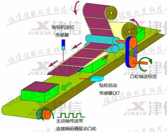 凸輪軸接收來自主軸的脈沖信號,依主軸節(jié)奏進行貼標動作,傳送標簽時需很準確平穩(wěn),在粘貼標簽時,必須要能穩(wěn)定控制運行速度與主軸同步,否則標簽貼起來會不平順。